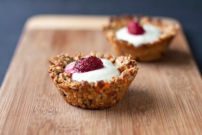fruit like raspberries. Make sure not to add the yogurt too long before serving or the granola cups will become somewhat soggy.